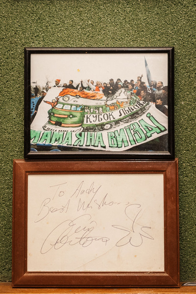Auf einem Bildschirm, der über der Theke in der Altstadtkneipe Cantona hängt, laufen die Spieler in ukrainische Fahnen gehüllt auf das Spielfeld. Hinter der holzvertäfelten Theke zapft Andy Bier, ohne hinzusehen. Er verrenkt den Hals, um den Spielstart nicht zu verpassen. Ihm gehört die Fussballkneipe am Rande der historischen Altstadt von Lwiw. Der vordere Teil ist ganz seinem Helden gewidmet. Éric Cantona in Siegesposen, vier Mal englischer Meister mit Manchester United. Bilder davon schmücken die roten Wände. Ein Freund hat ihm ein Autogramm mitgebracht, „For Andy“ ist darauf gekritzelt. Es hängt gerahmt über der Theke. Es sei wie in jeder guten Kirche. Die Gläubigen versuchen ein kleines Stück von ihren Heiligen zu bekommen, sagt er lachend. Seine Kneipe ist vollgepflastert damit.