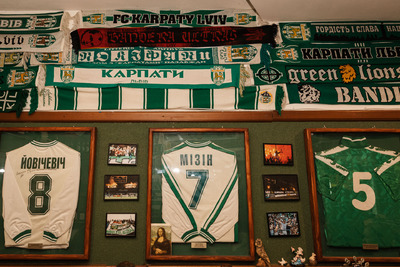 Hinten vor der Bar ist alles grün, die Tapete, die Trikots, die Fanschals und Lederbezüge der Eckbänke. Andys Verein heißt Karpaty Lwiw, der dritte große Fussballclub der Stadt, und wohl der mit der glühendsten Anhängerschaft, obwohl der Verein durch finanzielle Probleme inzwischen in die 3.Liga abgesackt ist. Seinen Job als Journalist bei einem TV-Sender hat Andy gekündigt und alles in seine Kneipe gesteckt. Die neue Saison sei wie ein Unterschlupf für die Gedanken, sagt er. „Für ein paar Dutzend Minuten kann ich woanders sein, beim Spiel, dann zählt nur das.“