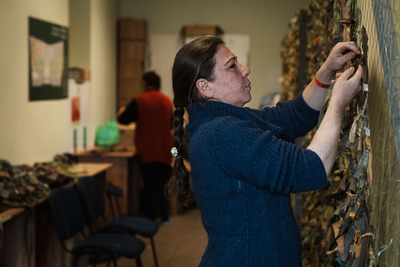 Dort wo sonst die Prominenz sitzt, die Clubpräsidenten und Mäzene, steht jetzt Stockbett an Stockbett. In der VIP-Lounge der Arena Lwiw leben Geflüchtete aus dem ganzen Land. Das Stadion liegt am südlichen Rand von Lwiw. Wer aus dem Stadtzentrum dorthin will, passiert eine Panzersperre, weiße Sandsäcke. In einem verglasten Kasten, hoch über dem Spielfeld, schlafen sie, über 120 Menschen in den Konferenzsälen und Ehrenlogen. Im Saal für die Pressekonferenzen gibt es warme Suppe. In den Katakomben knüpfen Frauen Stoffreste zu Tarnnetzen für die Front.