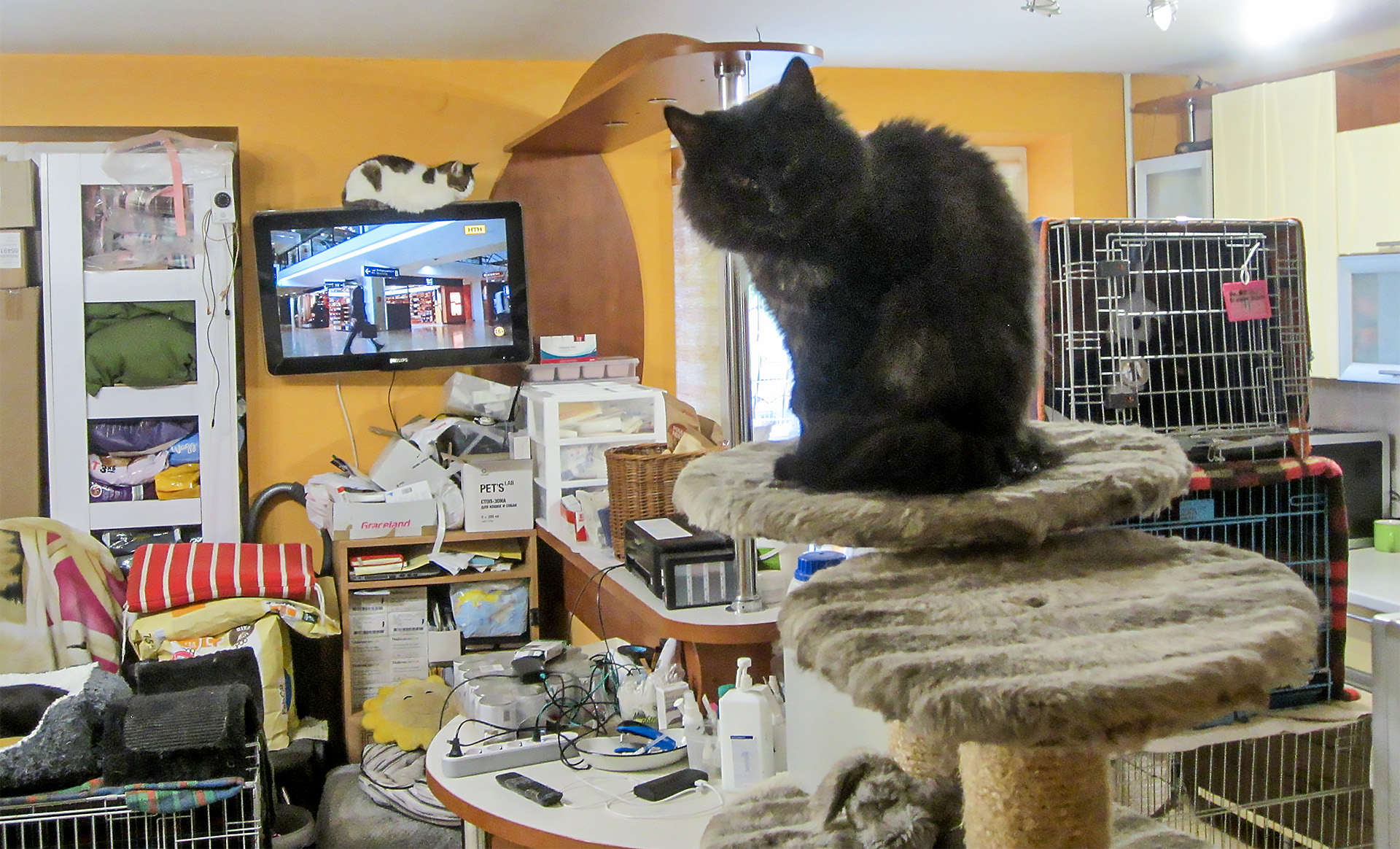 Es ist eine ganz normale Wohnung im Erdgeschoss, durch den Hausflur wabert der intensive Geruch von Katzenfutter. Hier leben 90 Katzen, es miaut aus allen Ecken. Auf dem Tisch, dem Sofa, sogar auf dem Fernseher: überall Katzen, in allen Größen und Farben.