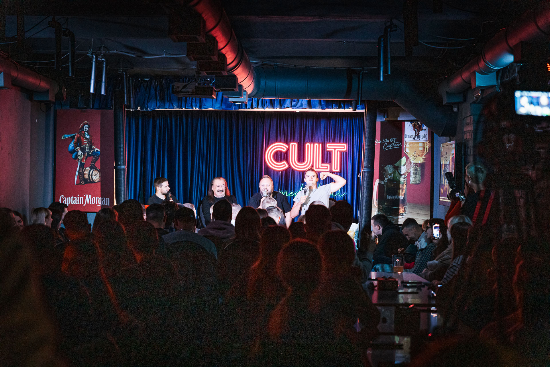Die „Cult Comedy Hall“ ist ein Schlauch aus Backsteinen und Belüftungsrohren, rund zwei Meter unter der Erde gelegen. Der Raum gilt als Bunker, sodass die Show auch bei einem Luftalarm weiter gehen kann. Beinahe jeden Abend treten Comedians auf der kleinen Bühne auf, mal mit mehr, mal mit weniger politischem Programm. Einen Teil der Einnahmen spenden die Betreiber an die ukrainischen Streitkräfte.